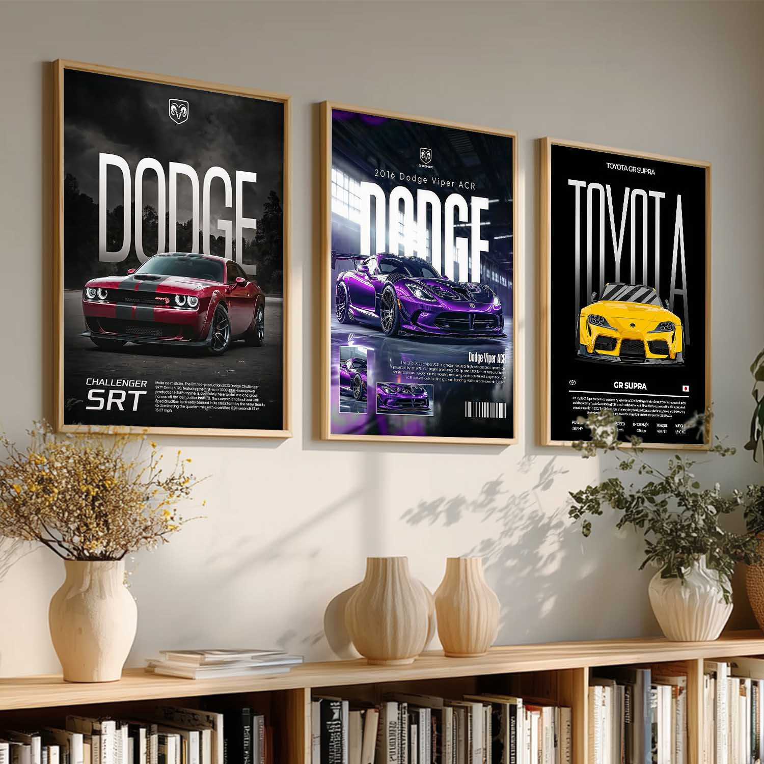 Big Dodge Challenger, Dodge Viper, Toyota Supra Cars Wall Art Paintings for Living Room Bedroom