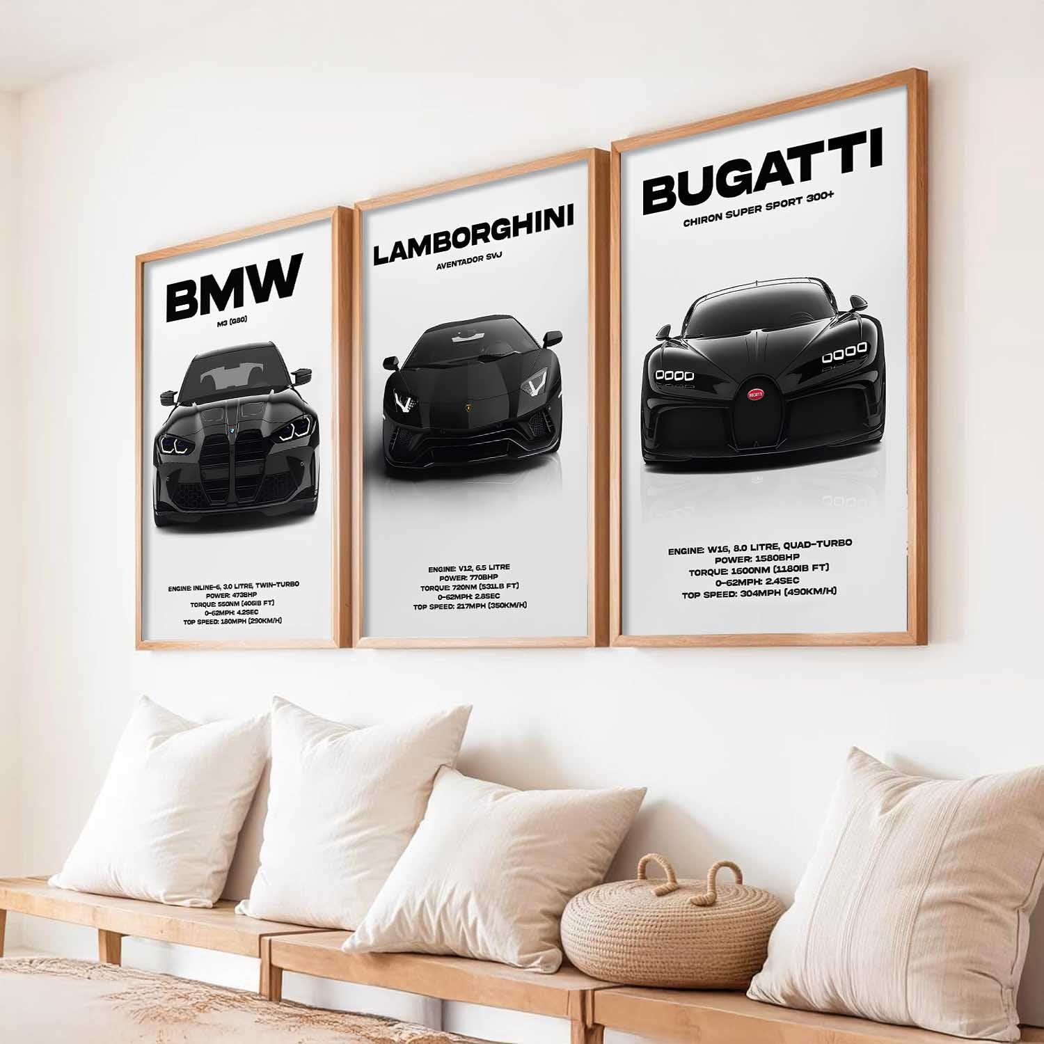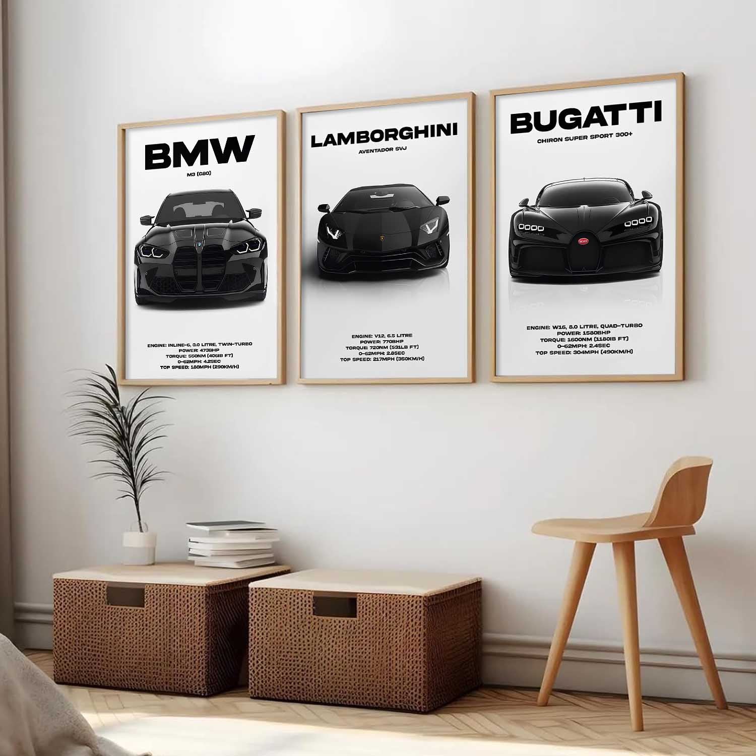 Big BMW M3, Lamborghini Aventador, Bugatti Chiron Cars Wall Art Paintings for Living Room Bedroom