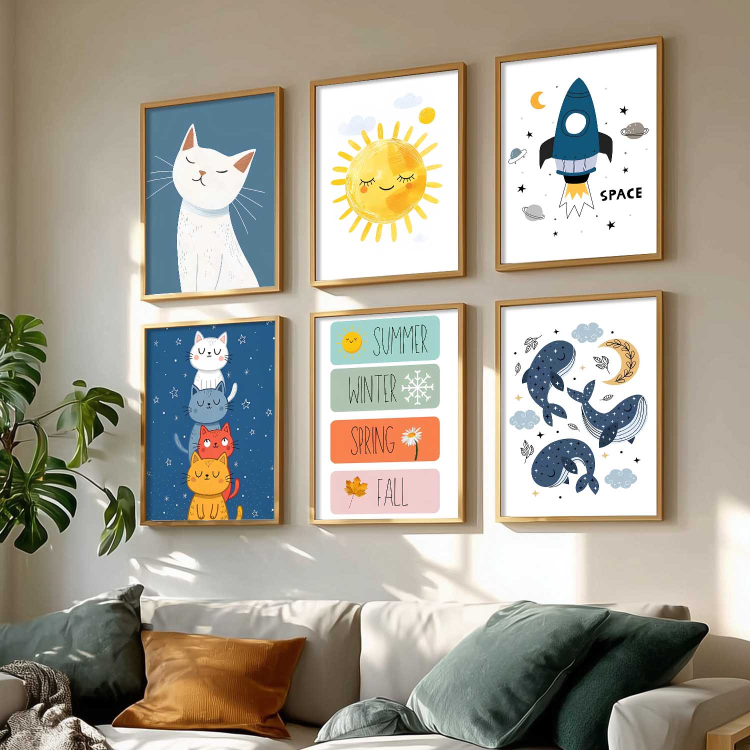 Seasons Sun Cats Whales Cartoon Animals Wall Art Paintings with Frame for Living Room Bedroom