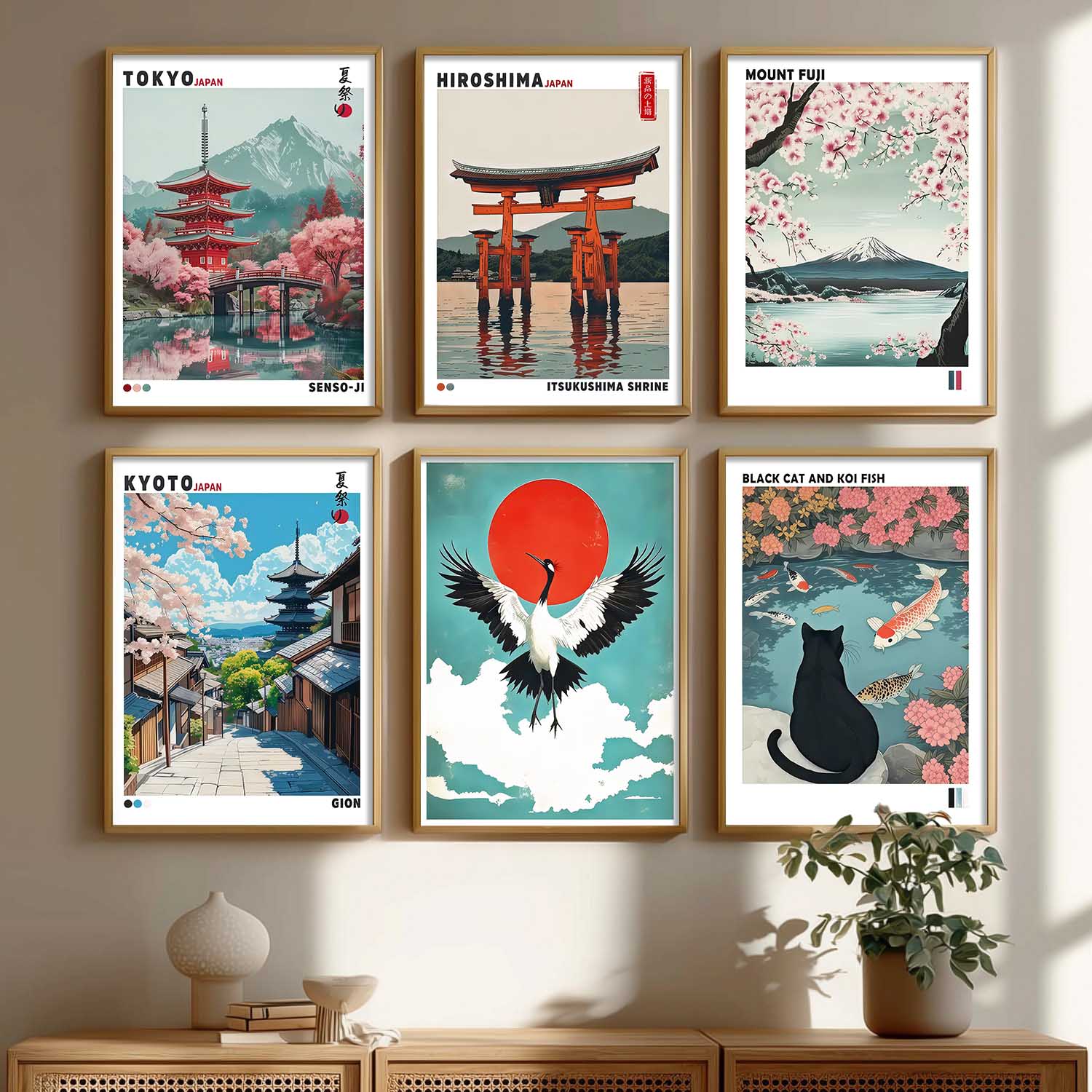 Japanese Nature Art and City View Aesthetic Wall Art Paintings with Frame for Living Room Bedroom