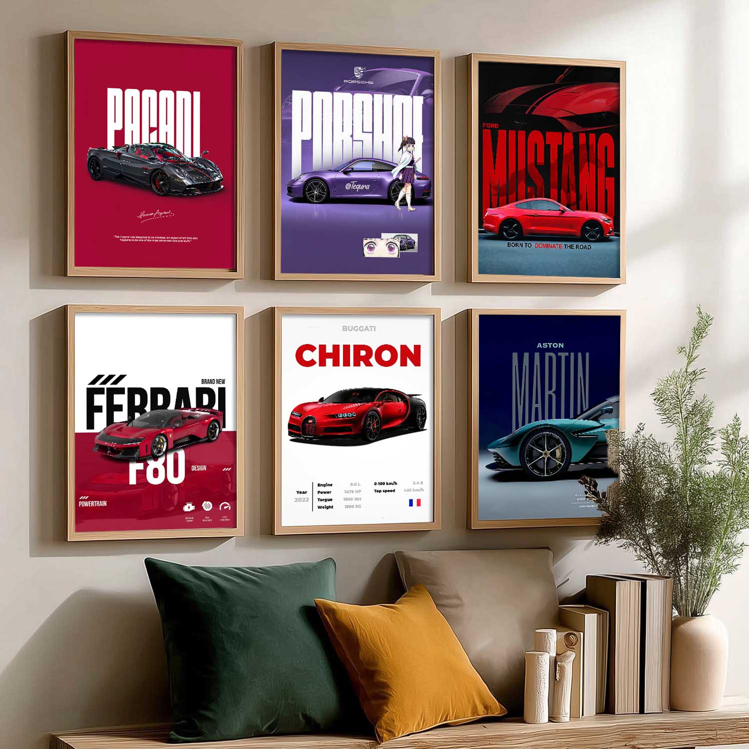 Porsche 911 Ford Mustang Bugatti Chiron Car Wall Art Paintings with Frame for Living Room Bedroom