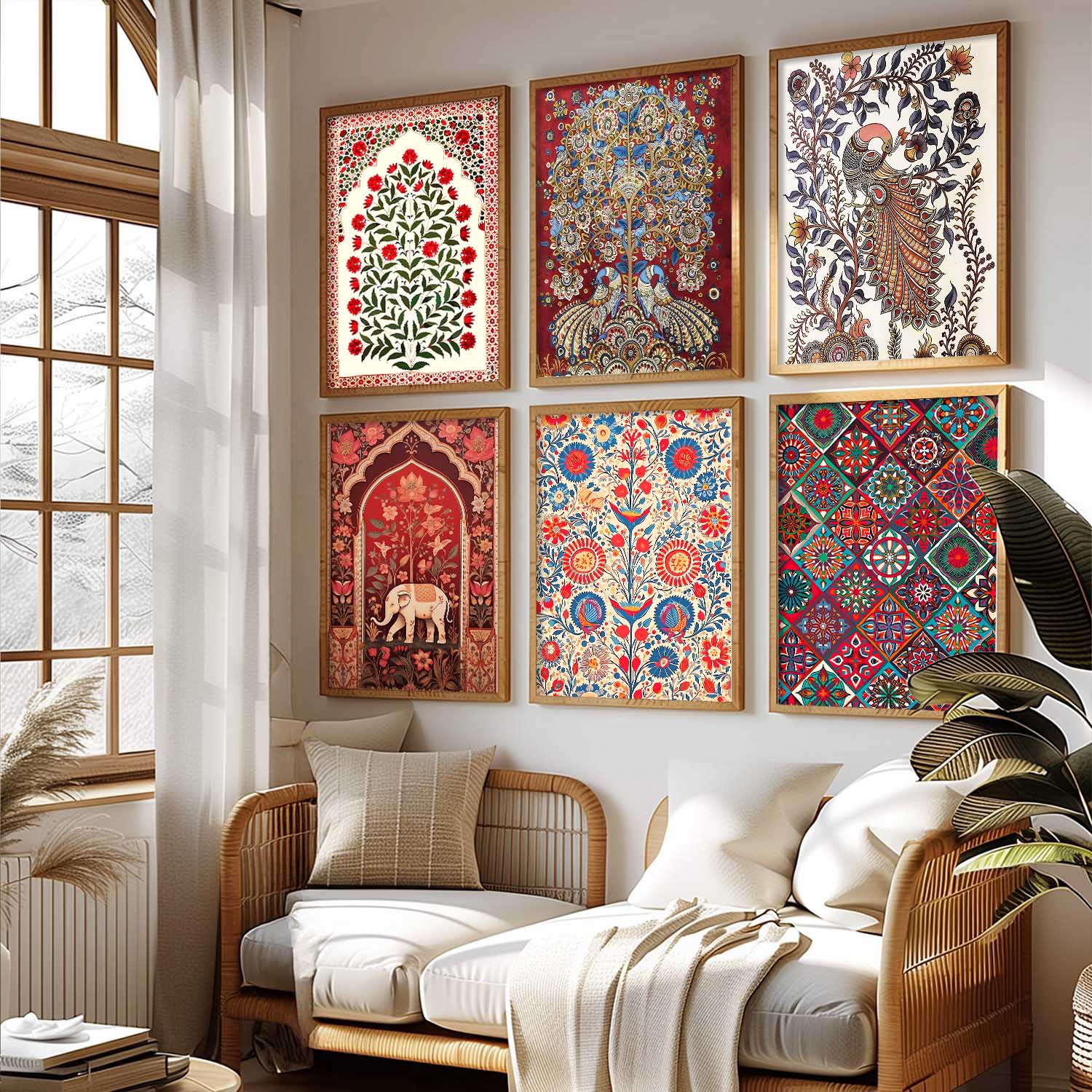 Traditional Indian Art Framed Prints for Elegant Home Decor Set of 6