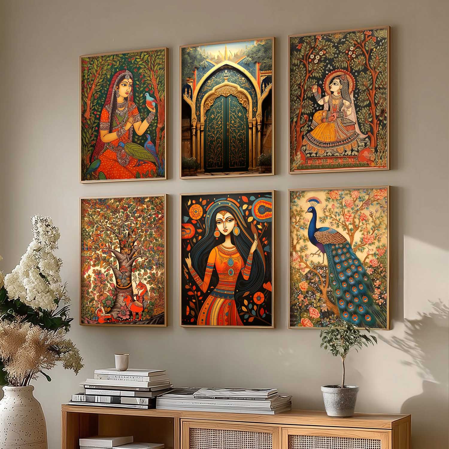 Traditional Indian Inspired Madhubani Art Prints with Frame for Living Room Bedroom Home and Office Wall Decor Set of 6