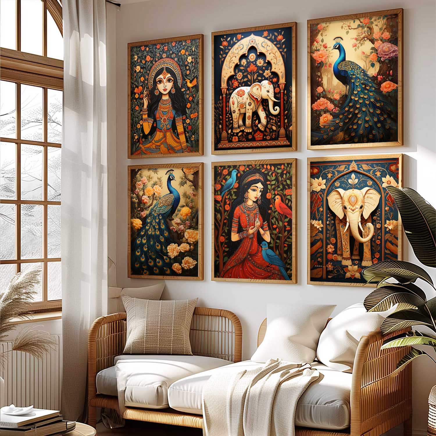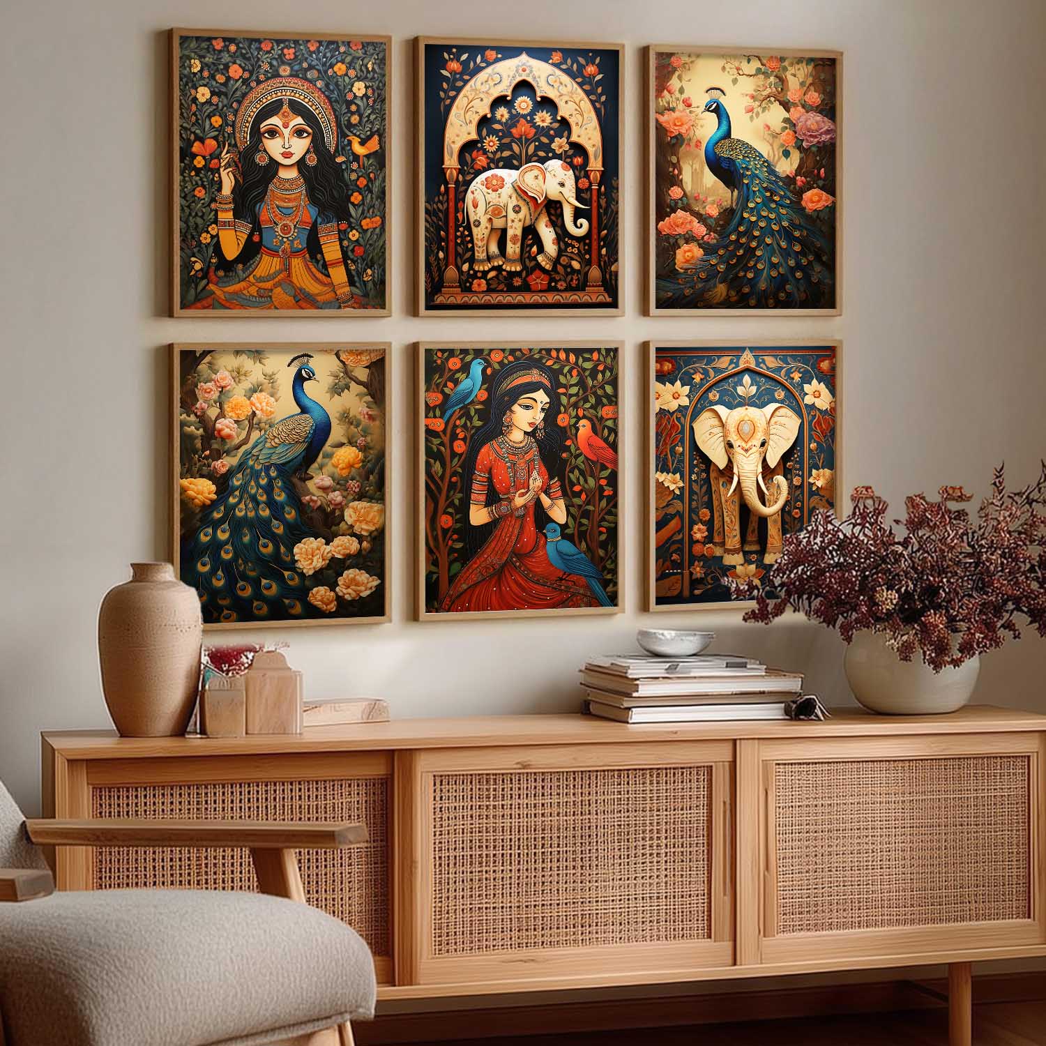 Traditional Indian Inspired Madhubani Art Prints with Frame for Living Room Bedroom Home and Office Wall Decor Set of 6