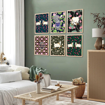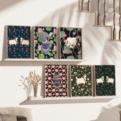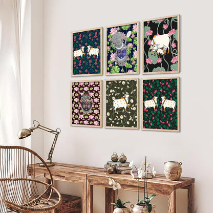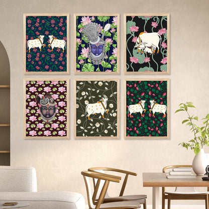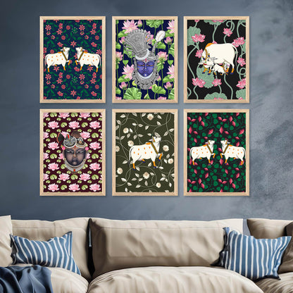 Traditional Indian Inspired Pichawai Art Prints with Frame for Living Room Bedroom Home and Office Wall Decor Set of 6