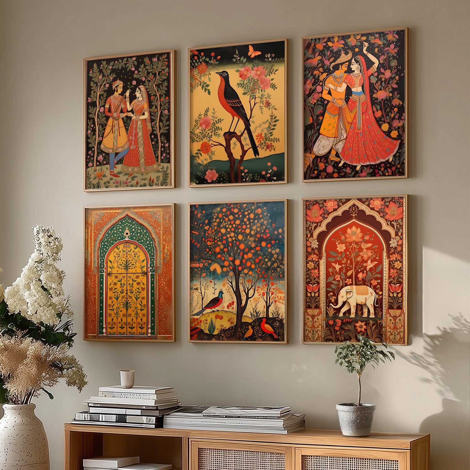 Traditional Indian Pichwai Art Framed Prints for Elegant Home Decor Set of 6