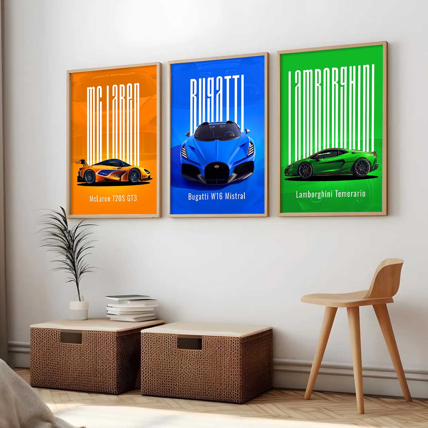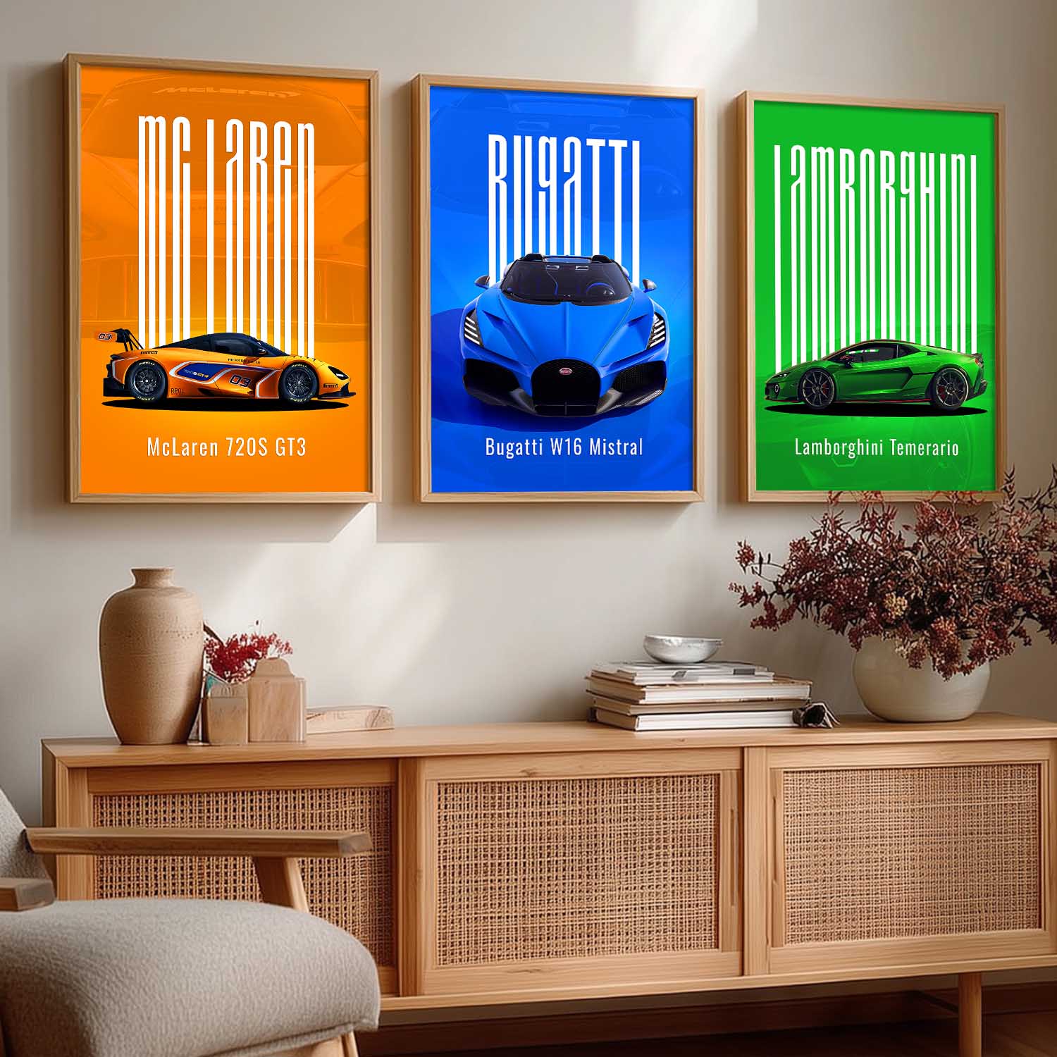 McLaren GT3, Bugatti W16 Mistral, Lamborghini Temerario Wall Art Paintings for Living Room