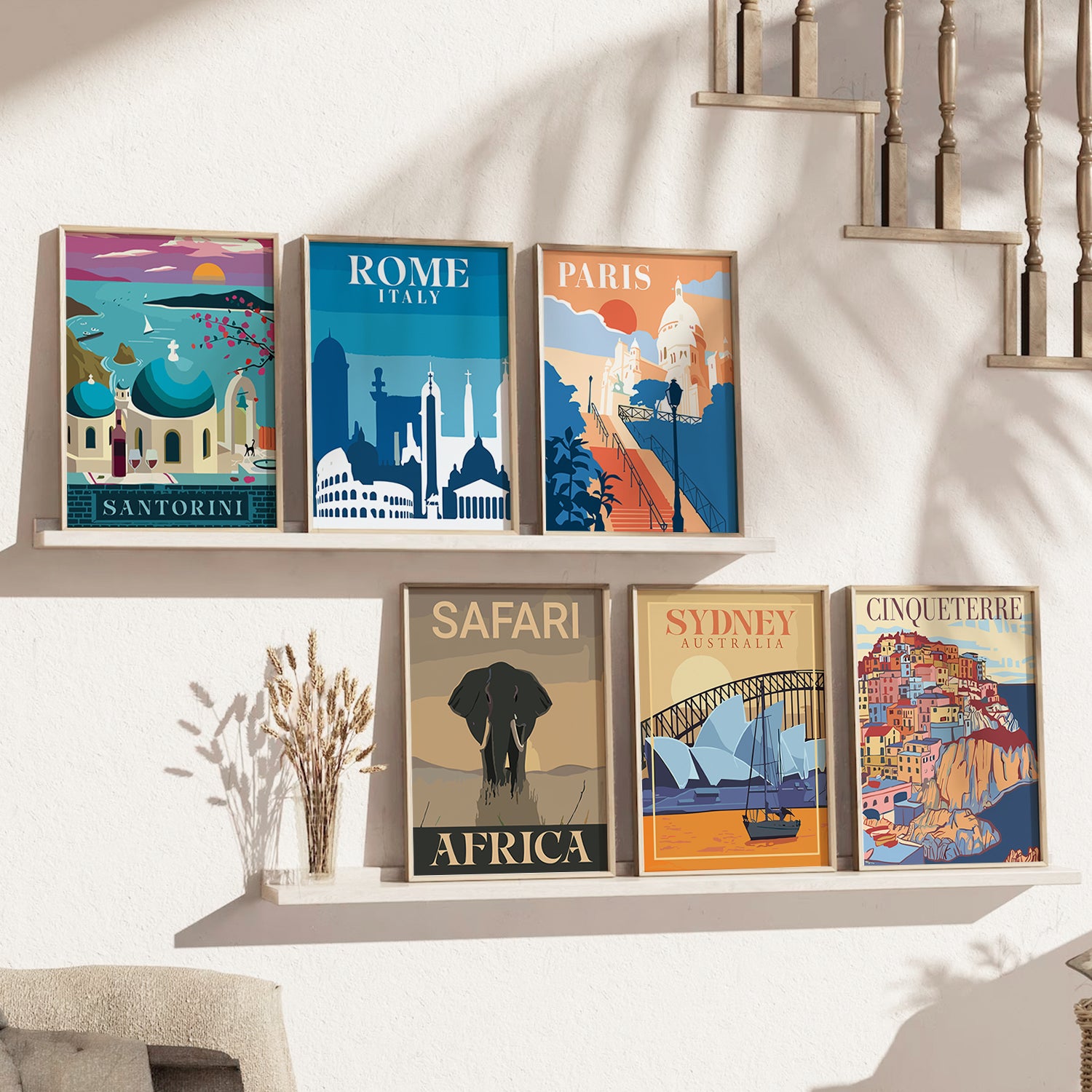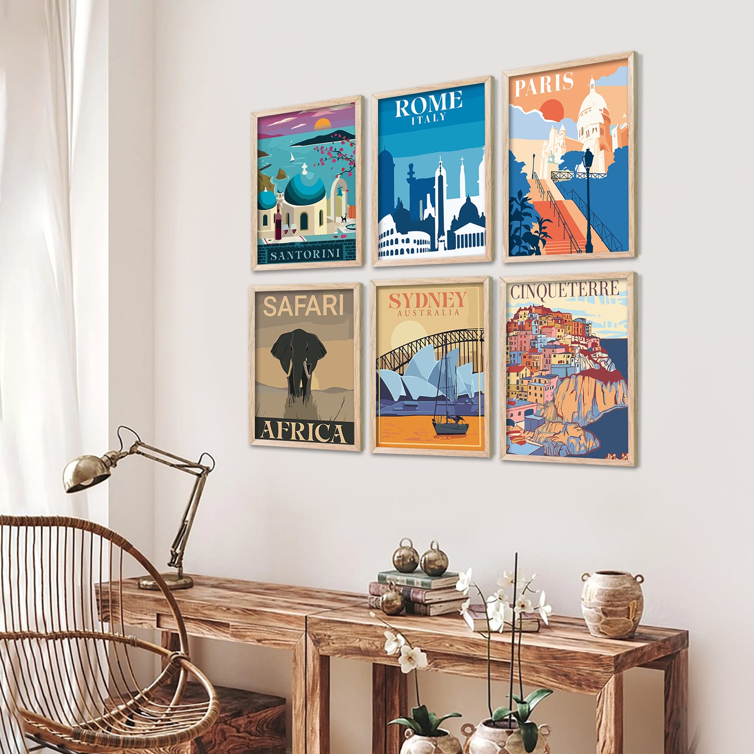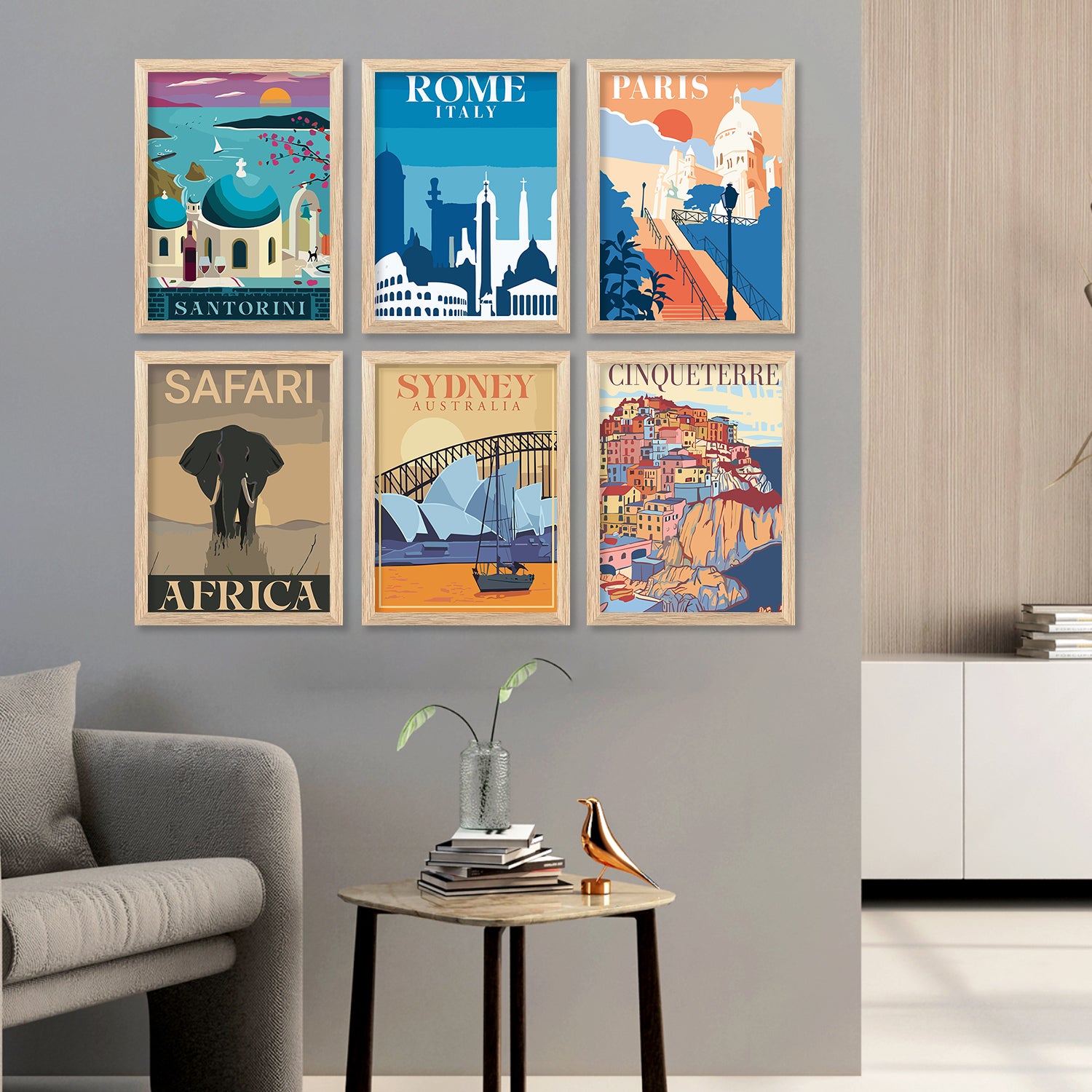Travel Theme Iconic City View Retro Framed Posters for Wall Decor Set of 6